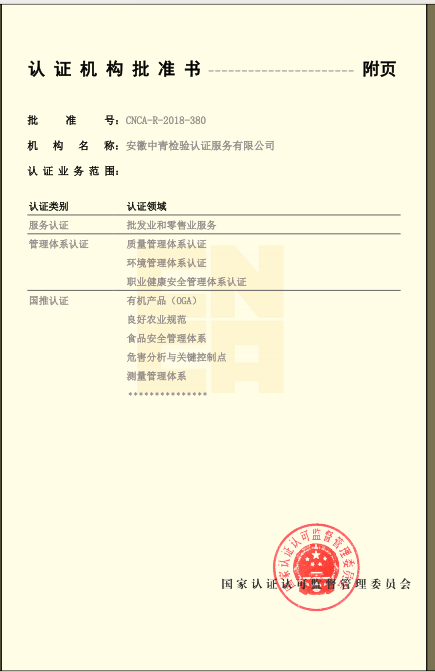 安徽省“食安安徽”品牌認證:評價是根據國際通行的合格評定方式,依據“食安安徽”品牌認證評價標準及相關規定,對申請“食安安徽”認證評價的食品生產經營者和特定區域進行的第三方認證評價活動。“食安安徽”品牌認證評價標準包括企業認證和區域評價兩大類,企業認證對象包括食用農產品生產者、食品生產企業、食品流通企業、餐飲服務企業,區域評價對象包括食品生產基地、食品生產園區、餐飲安全街區、食品安全小鎮、安徽省食品安全示范縣(市、區)。